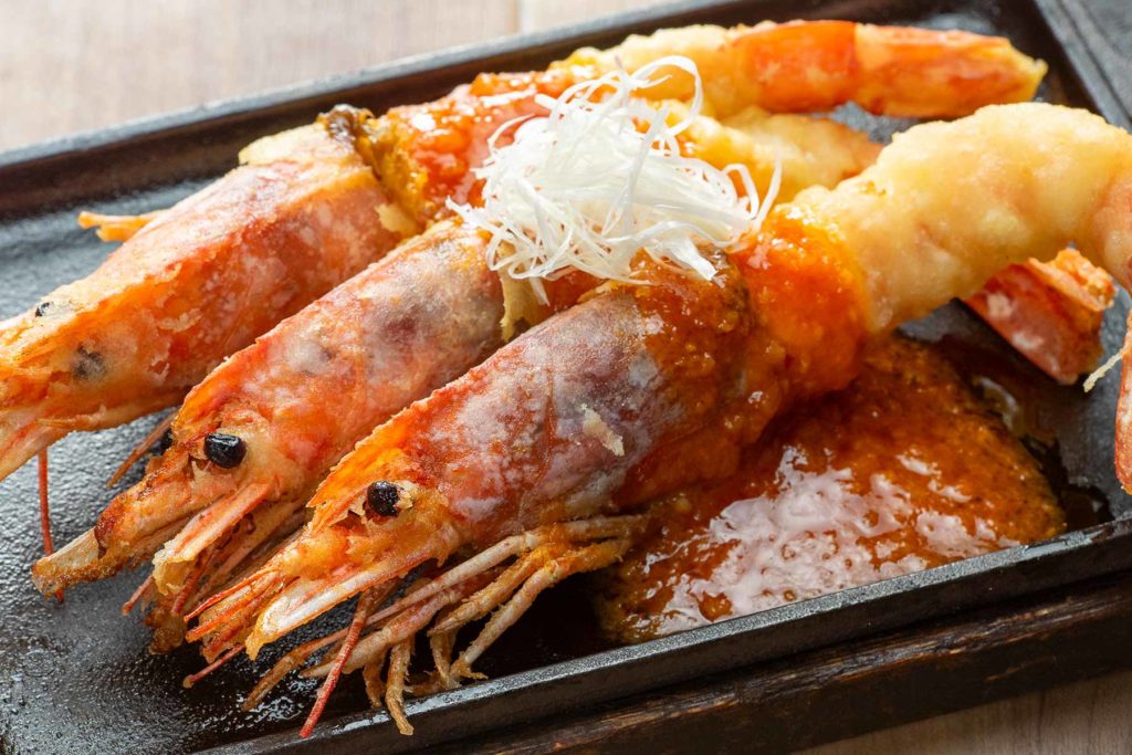 頭付きの大きなエビフリッターに、チリソースをジュワ〜!
